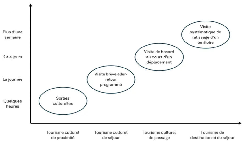 Une visite culturelle s’inscrit dans une dynamique totalement différente selon la durée et le contexte de visite. L’enseignant en management culturel Pierre Chazaud, dans son article « Sociologie du tourisme culturel et stratégie marketing », illustre ce phénomène par un schéma :
