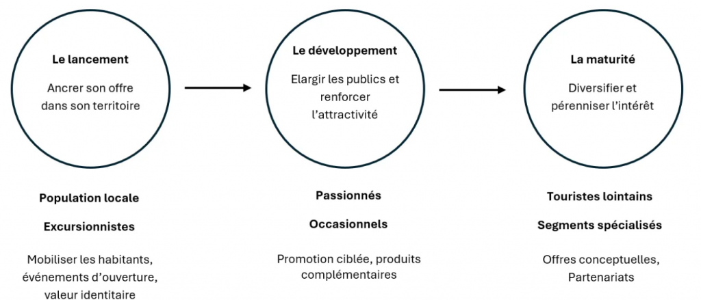 À ce stade, la cible s’élargit à des clientèles touristiques plus lointaines : d’abord les visiteurs assidus et passionnés du thème traité (histoire, art, nature, savoir-faire…) puis un public plus diversifié.